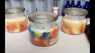 Making a tie dye candle, or marbled affect, colour your glass with wax, let that set, then add melted cool wax, cool enough not to let it melt the side walls, let the whole candle set, then...